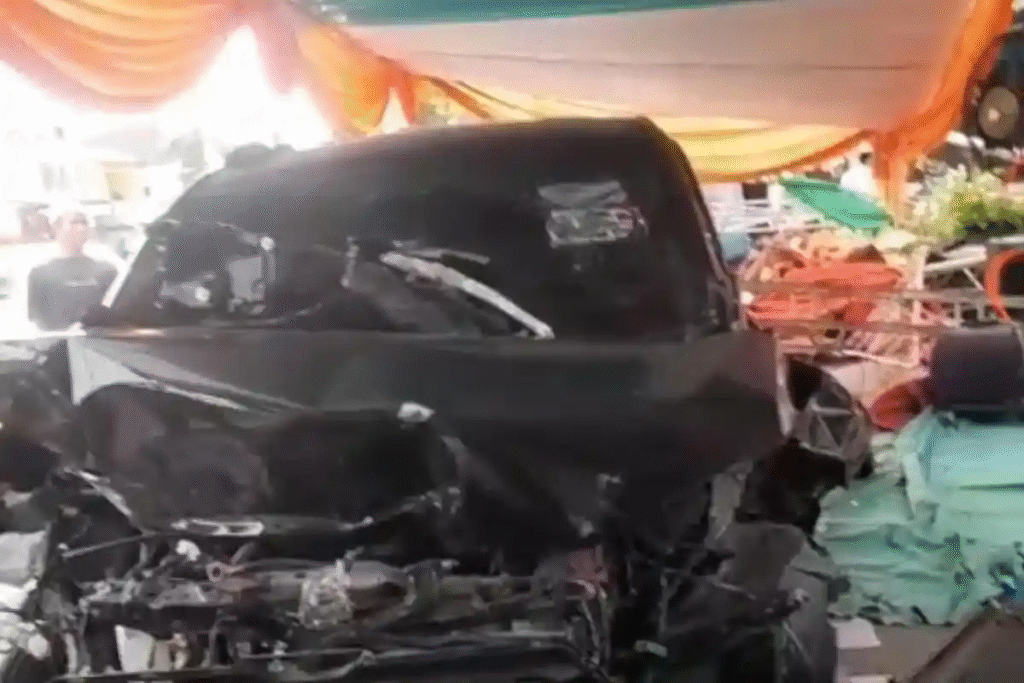 Benturan kuat membuat rangka tenda roboh. Peralatan sound system yang terpasang untuk acara keagamaan itu rusak berat karena tertabrak mobil.